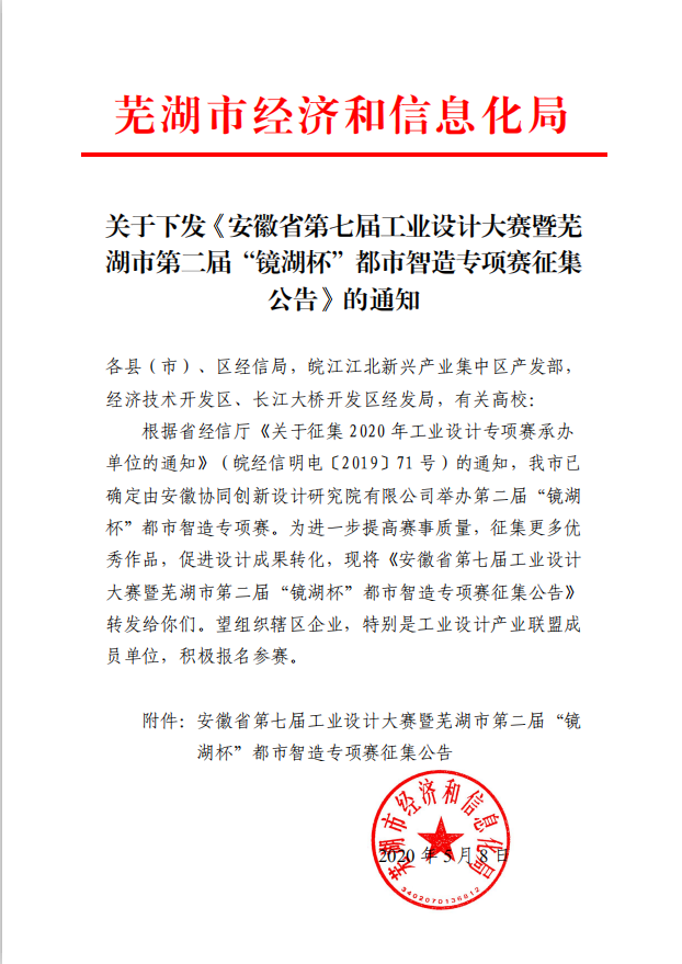 為進一步加快蕪湖市現代制造產業的升級轉型,加速工業設計與制造的融合,培養工業設計人才,決定舉辦安徽省第七屆工業設計大賽暨蕪湖市第二屆“鏡湖杯”都市智造專項賽。